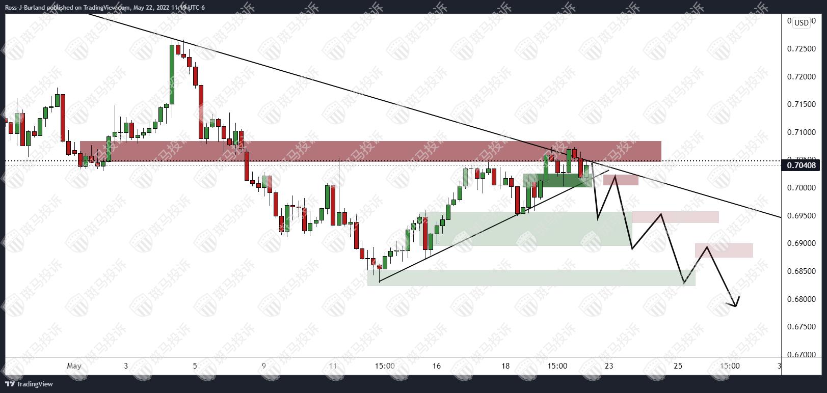 以上说明澳元兑美元维持看跌倾向。价格处在支撑和阻力区间,但预期若澳元兑美元跌破支撑将下行 0.6700 区域。