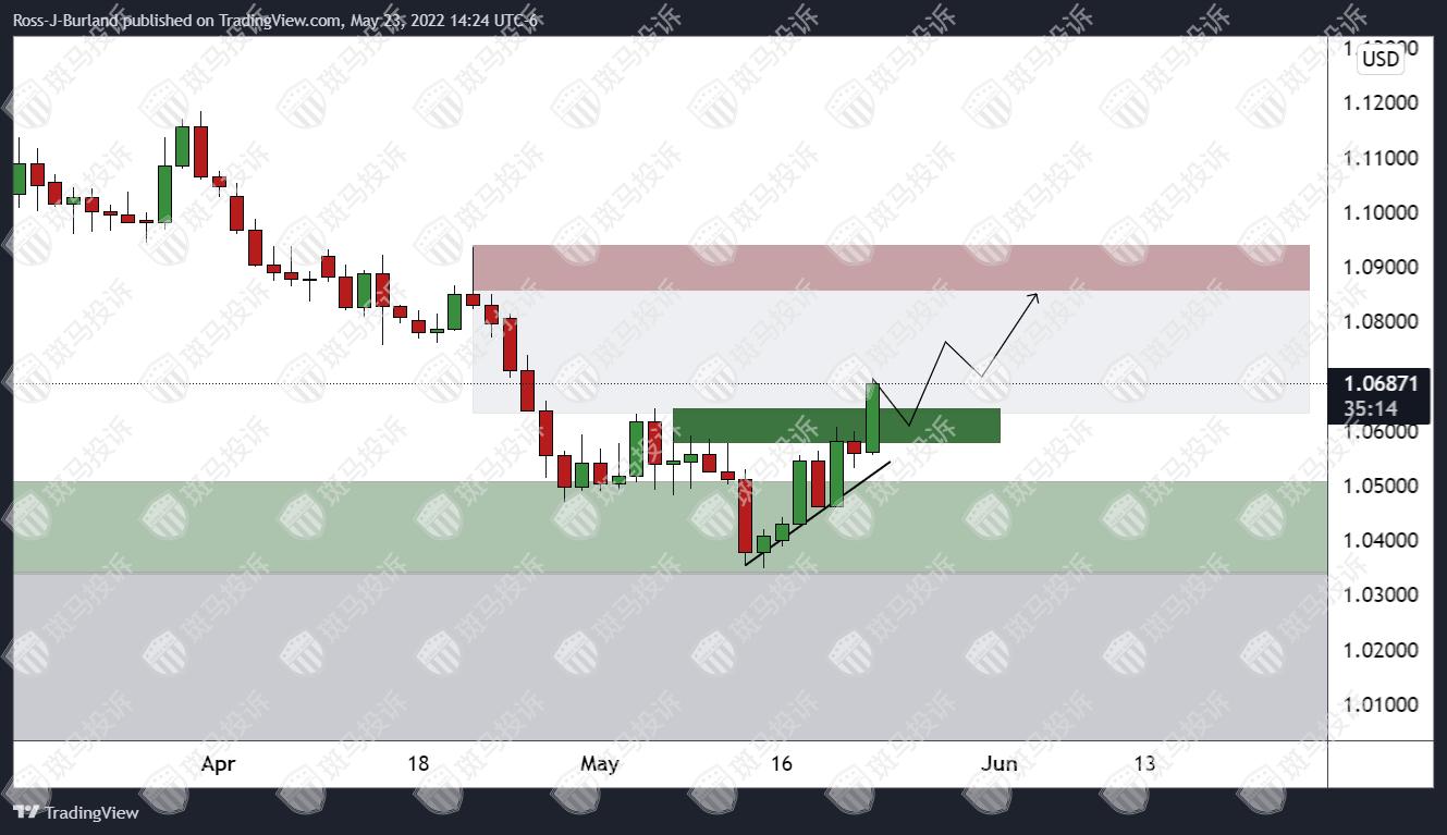 欧元上涨1.2%,上涨至 1.0687 附近,自 1.0556 低点上涨至整理高位 1.0697。随着美元继大幅上涨 10% 后自高位回落,欧元兑美元多头仍坚守。