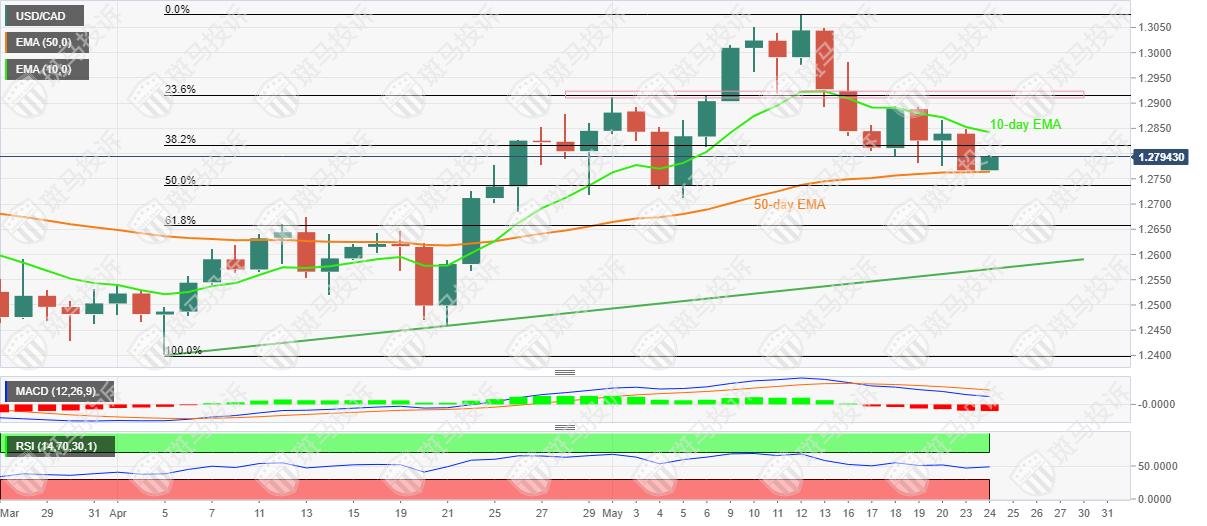 美元兑加元继录得最大单日跌幅触及两周低点后,再度上涨处在 1.2800 附近。周二亚市,在这期间美元兑加元自 50 日均线反弹。
