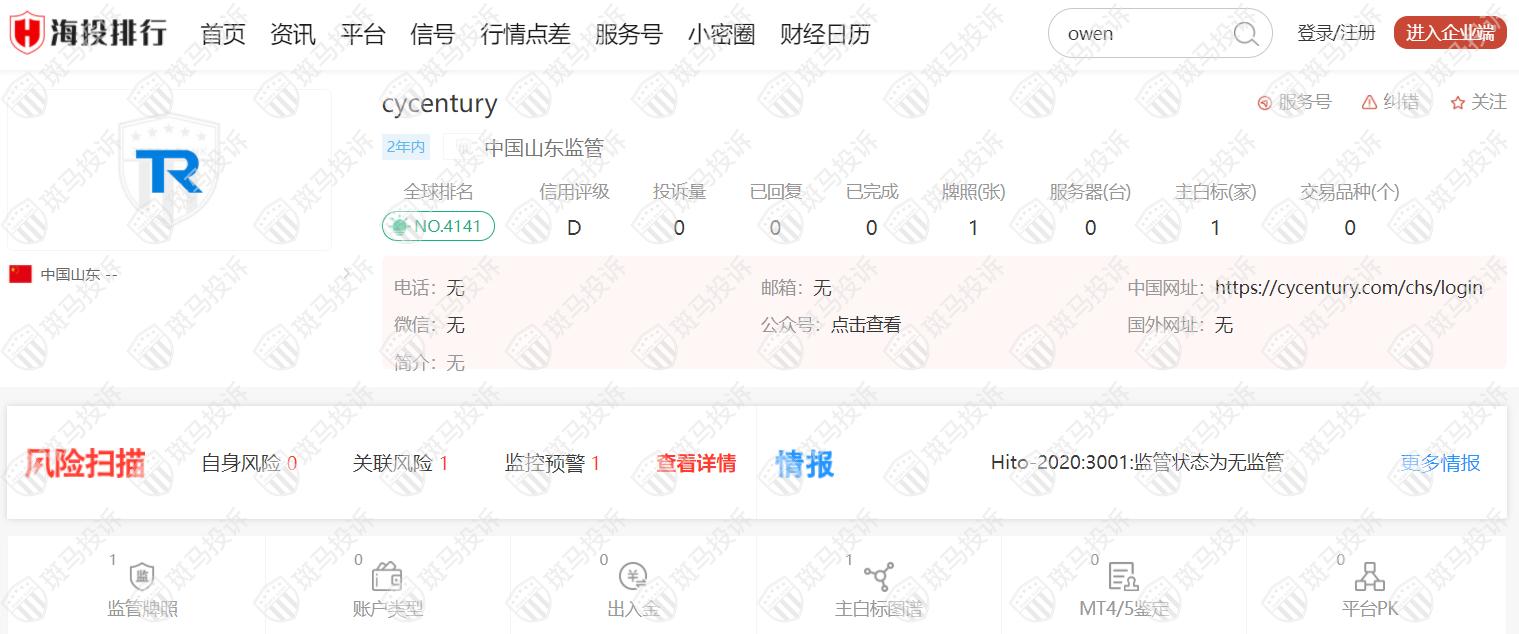 这家平台叫cycentury,成立于2020年,全球排名4141名,目前无监管,没有外汇牌照,不能做外汇保证金交易,风险扫描显示1条风险,投资者资金安全无保障。
