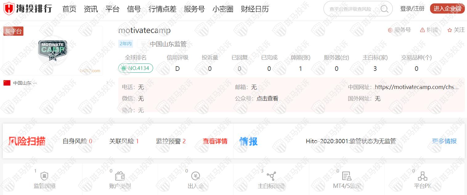 这家平台叫motivatecamp,成立于2020年,全球排名4134名,目前无监管,没有外汇牌照,不能做外汇保证金交易,风险扫描显示2条风险,投资者资金安全无保障。
