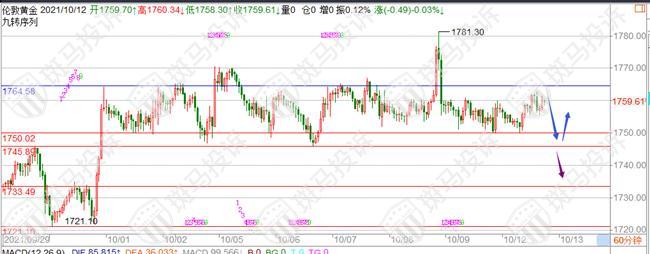 从时间上看,已经到了震荡结束,指数在逐渐萎缩,也就是距离突破区间不远了,因为本周两线收线都在1750区域的影子格局中,短期比较强势,但能否突破这个位置还要看非农前1782的技术压制,然后关注今晚的CPI数据。第一,如果今天的CPI年率超过5.3%,就意味着更高的通胀会压制金价不至于去空,支撑点在1745左右,反之亦然。