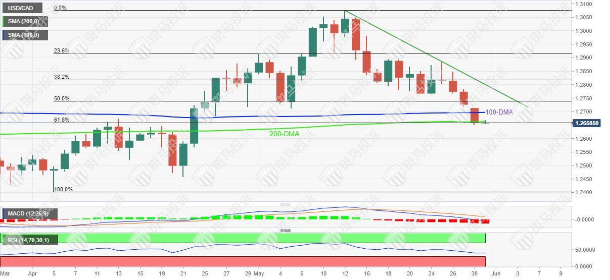 2022 年一季度加拿大 GDP 数据公布则处在盘整当中,而且 200 日均线和 4 月至 5 月上行趋势的 61.8% 斐波位汇合处 1.2660-55 附近,也成为空头目标。