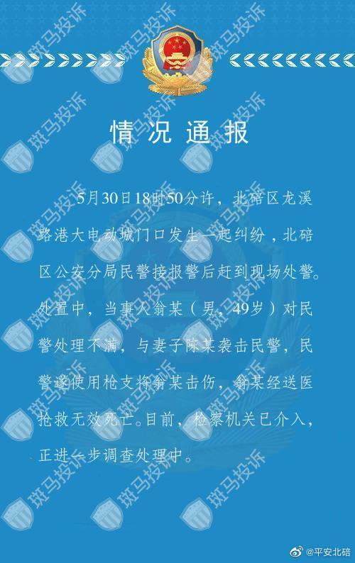 处置中,当事人翁某(男,49岁)对民警处理不满,与妻子陈某袭击民警,民警遂使用枪支将翁某击伤,翁某经送医抢救无效死亡。目前,检察机关已介入,正进一步调查处理中。
