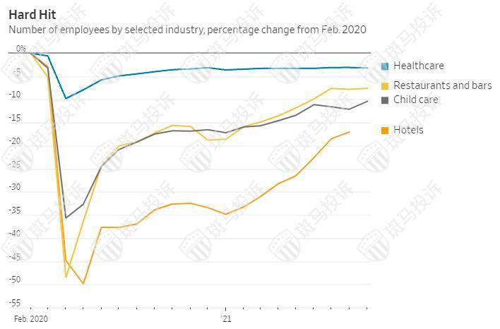 分析人士指出,眼下美国劳动力短缺的原因有很多,而且往往是相互关联的。例如,由于员工短缺,日托中心正在拒绝接待更多家庭幼儿的护理需求——美国劳工部的数据显示,与2020年2月相比,2021年9月儿童护理行业的就业人数减少了10.87万人,降幅为10.4%。同时与2020年2月相比,今年8月这一行业员工的薪酬上涨了10%。
