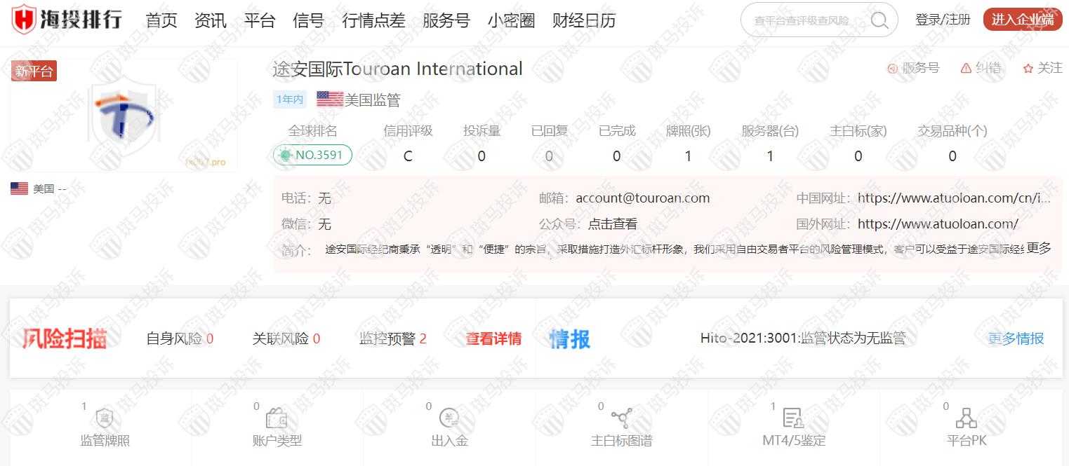 这家平台叫Touroan International途安国际,成立于2021年,全球排名3591名,目前无监管,没有外汇牌照,不能做外汇保证金交易,风险扫描显示2条风险,投资者资金安全无保障。