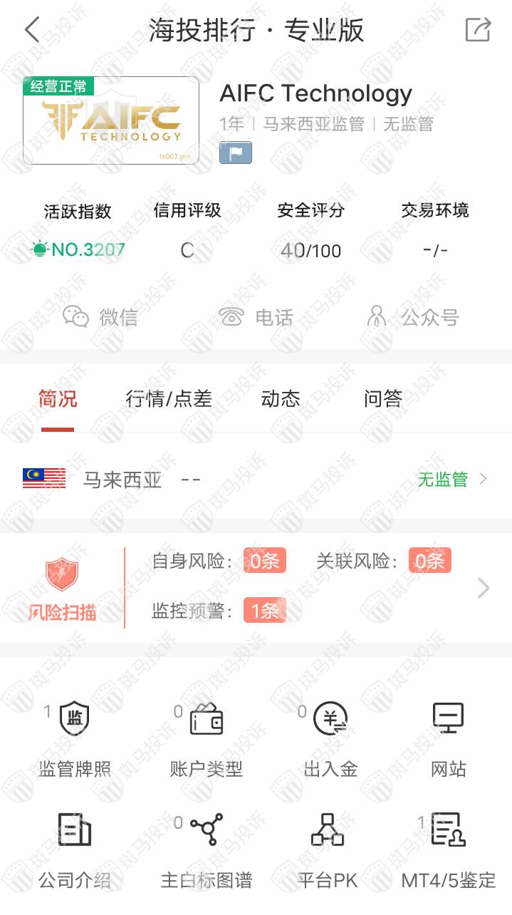 这家平台叫AIFC Technology,成立于2021年,全球排名3027名,目前无监管,没有外汇牌照,不能做外汇保证金交易,风险扫描显示1条风险,投资者资金安全无保障。