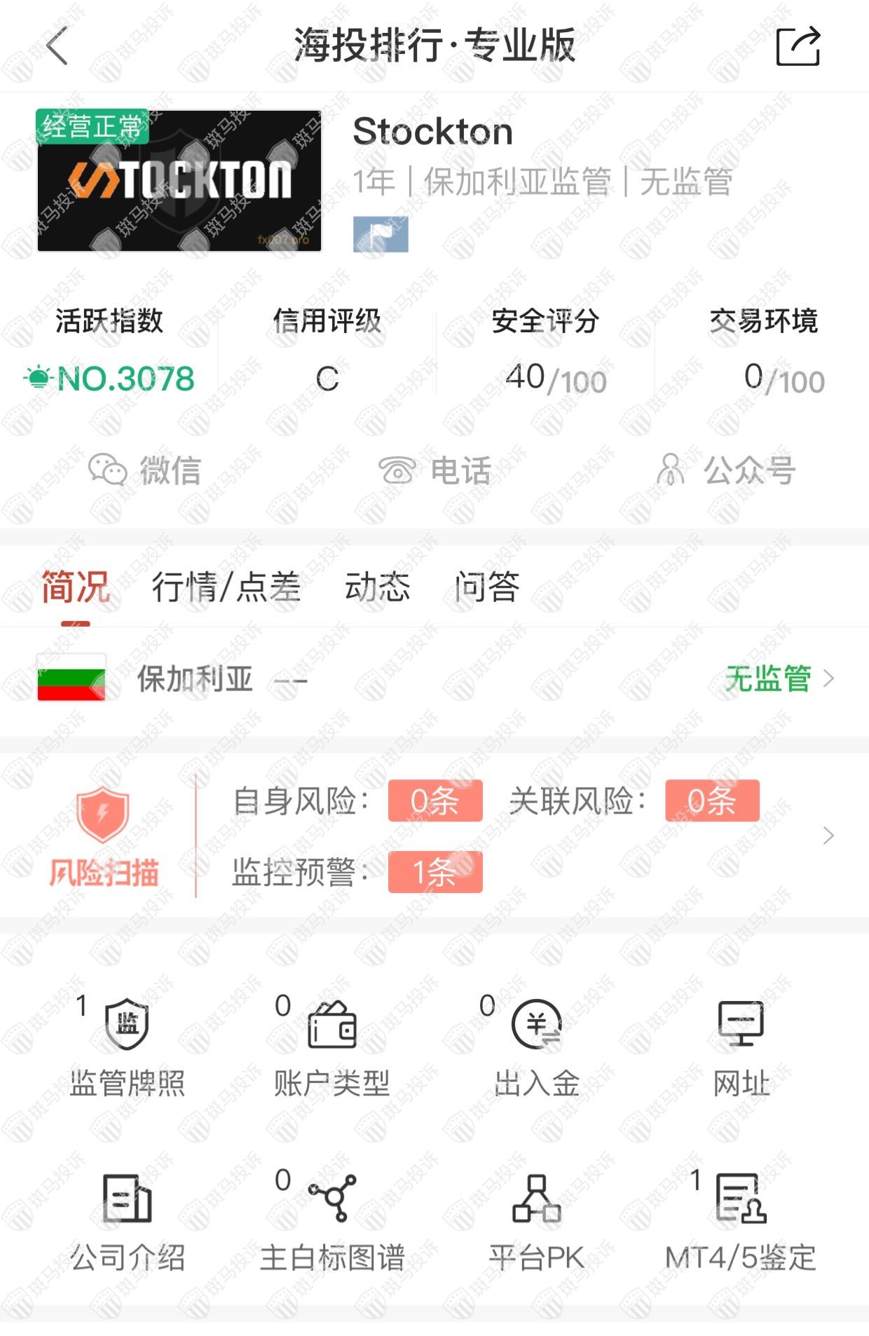 这家平台叫Stockton,成立于2021年,全球排名3074名,目前无监管,但是没有外汇牌照,不能做外汇保证金交易,风险扫描显示1条风险,投资者资金安全无保障。