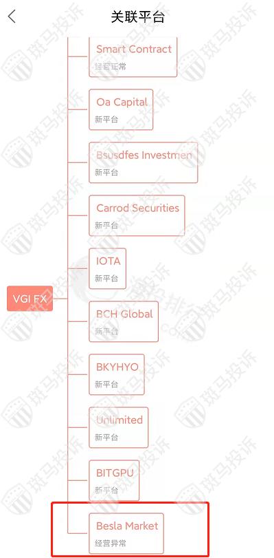 主白标关系显示,VGI FX平台和23家平台存在关联,其中Besla Market平台经营异常。