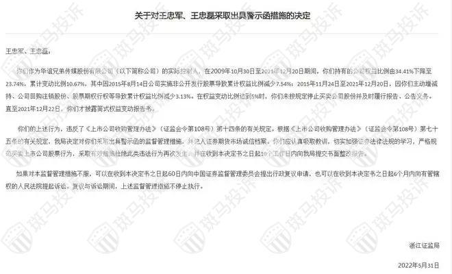 因未按规定减持股份,华谊兄弟实控人王忠军、王忠磊被浙江证监局处罚。近年来,华谊兄弟业绩承受巨大压力,2018年以来,其净利润连续四年亏损,共计亏损超64亿元。如今总市值仅为74亿元,与2015年巅峰时近900亿元的总市值相比,跌幅近九成。