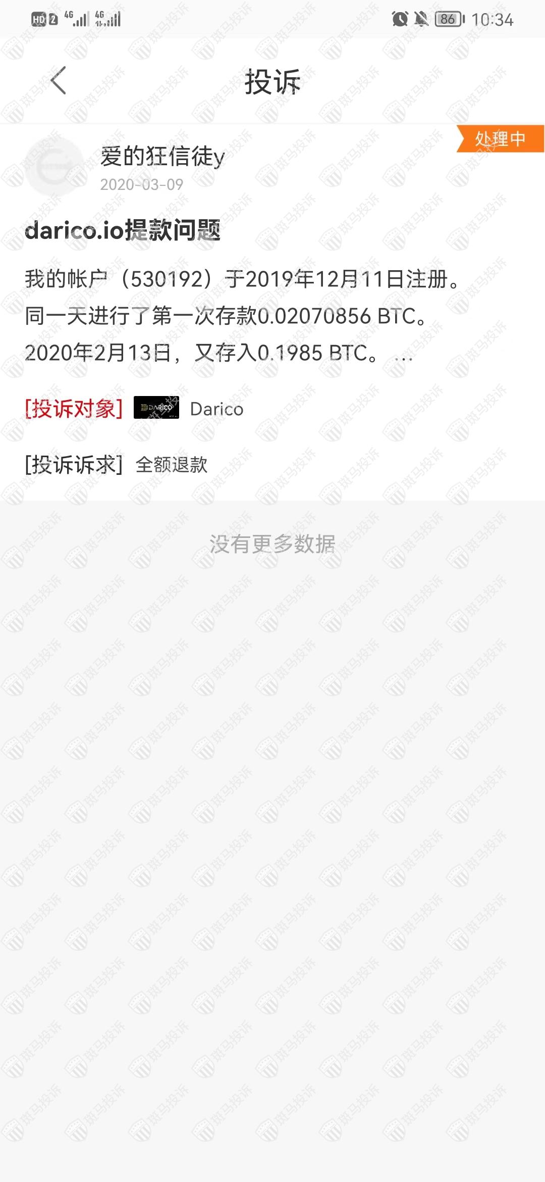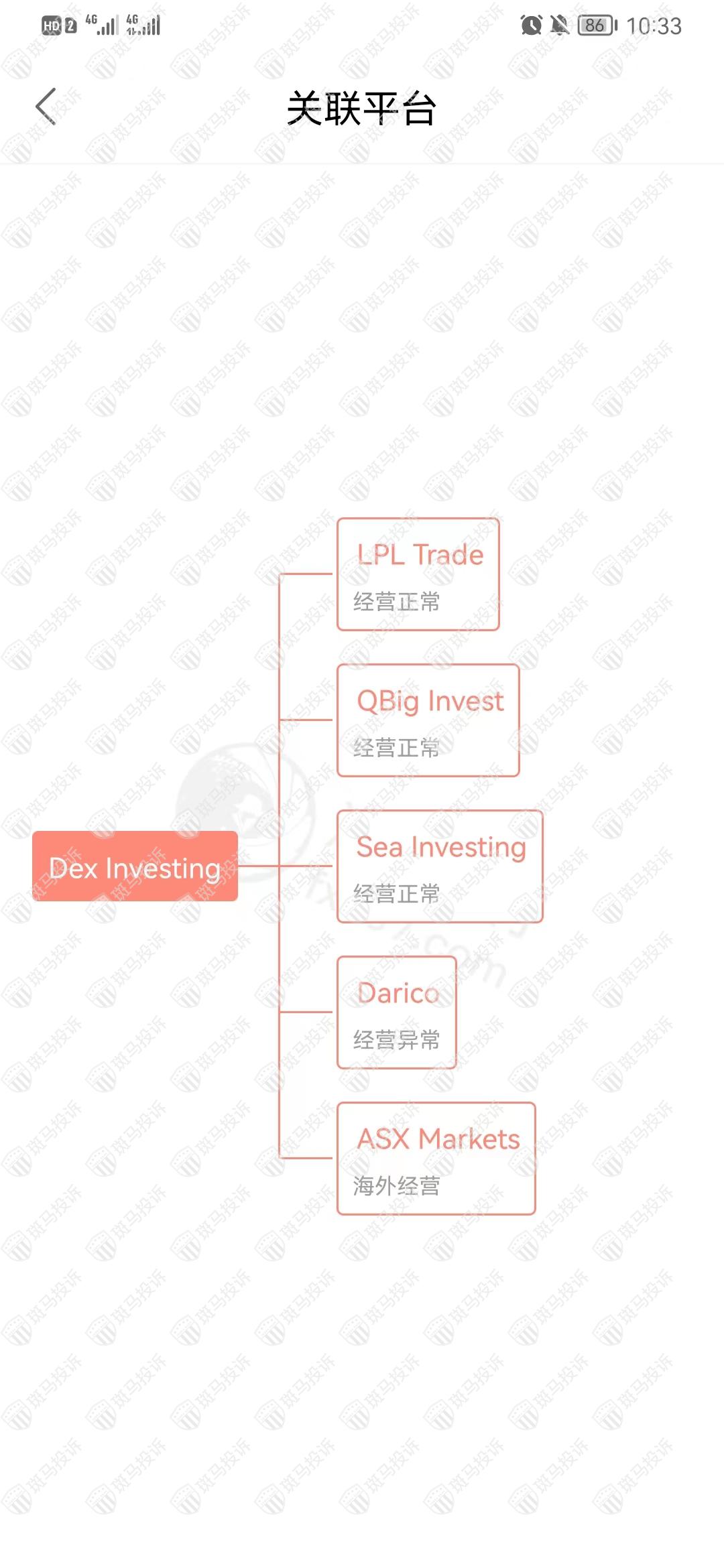 Dex Investing的关联平台Darico平台在斑马投诉已收到1条投诉,仍在处理中。