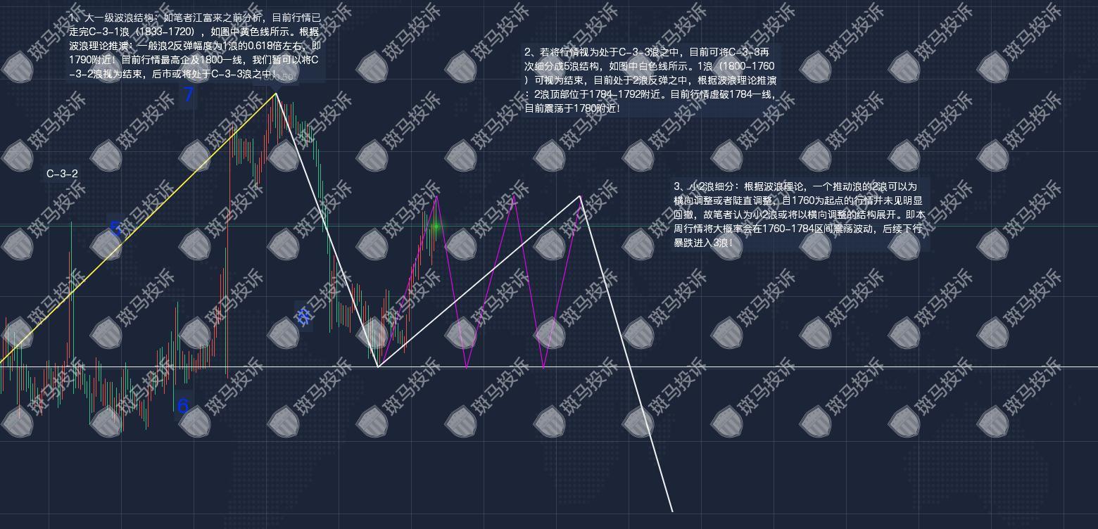 3.小二波细分:根据波浪理论,一个驱动波的二波可以水平调整,也可以陡峭调整,1760年以来的市场没有出现明显的回撤,因此笔者认为小二波可能是在水平调整的结构中发展起来的。即本周行情大概率在1760-1784区间波动,后续向下暴跌将进入3波!