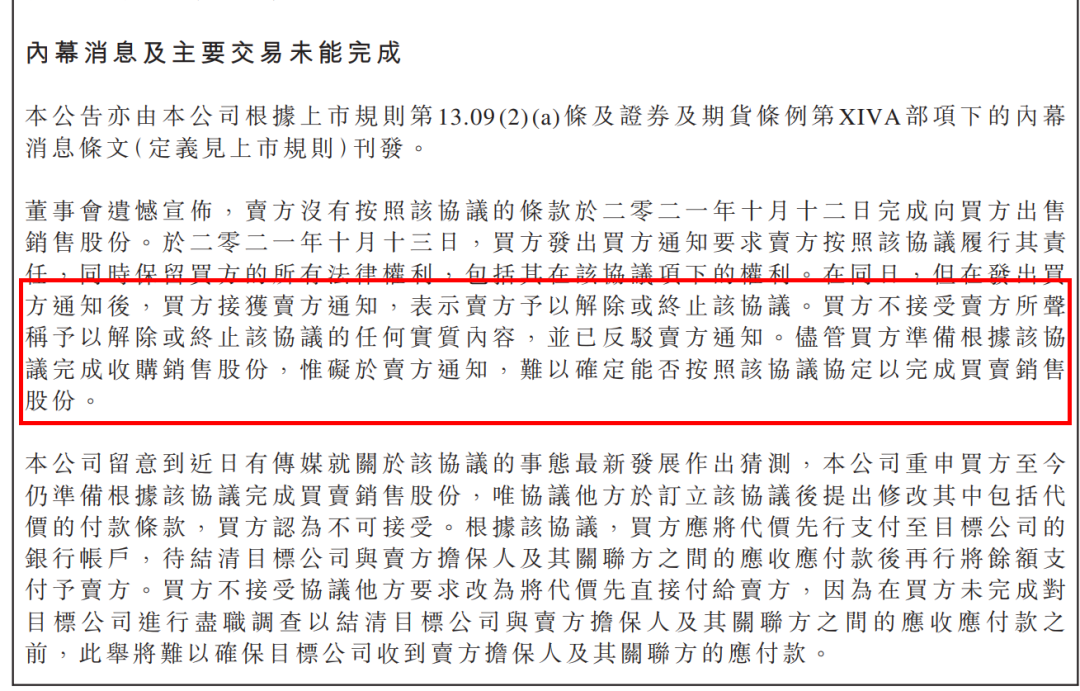 2021年 10月13日,公司发出买方通知要求卖方按照协议履行其责任,同时保留买方的所有法律权利,包括其在该协议项下的权利。 但在发出买方通知后,公司接获卖方通知,表示其予以解除或终止该协议。