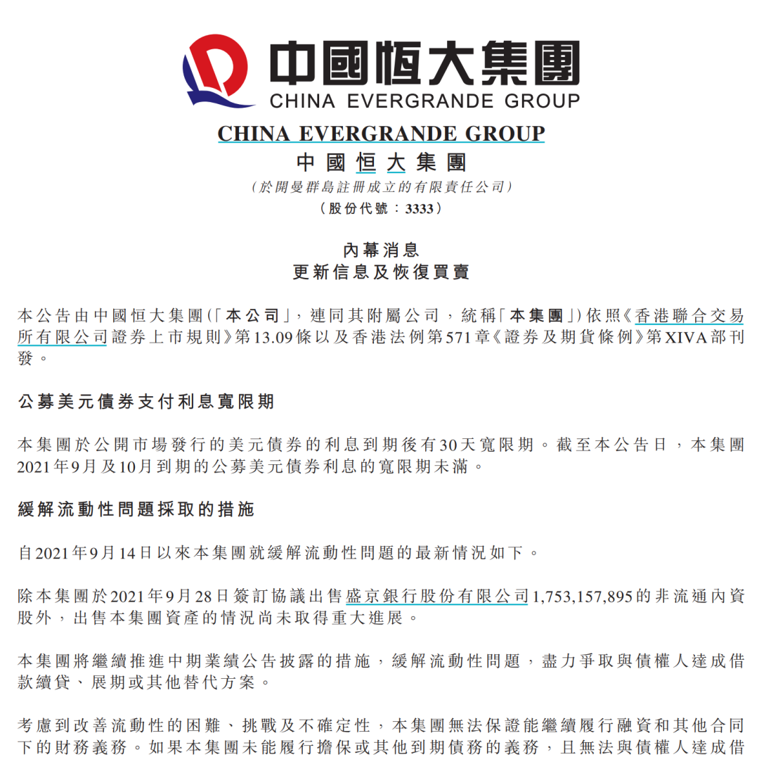 并同时公布了恒大公募美元债券支付利息还在宽限期内。