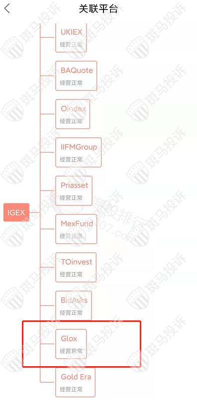 主白标关系显示,IGEX平台目前和19家平台存在关联,其中Glox平台经营异常。