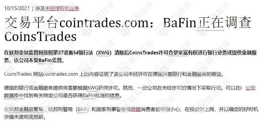 BaFin表示,根据CoinsTrades网站cointrades.com,该公司正在德国开展银行业务并提供金融服务,而无需获得所需的许可证。