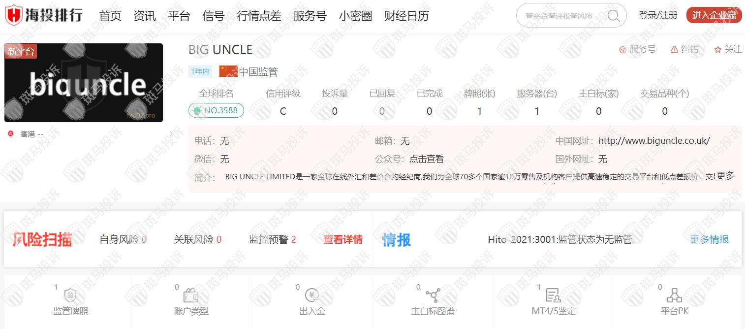 这家平台叫BIG UNCLE,成立于2021年,全球排名3588名,目前无监管,没有外汇牌照,不能做外汇保证金交易,风险扫描显示2条风险,投资者资金安全无保障。