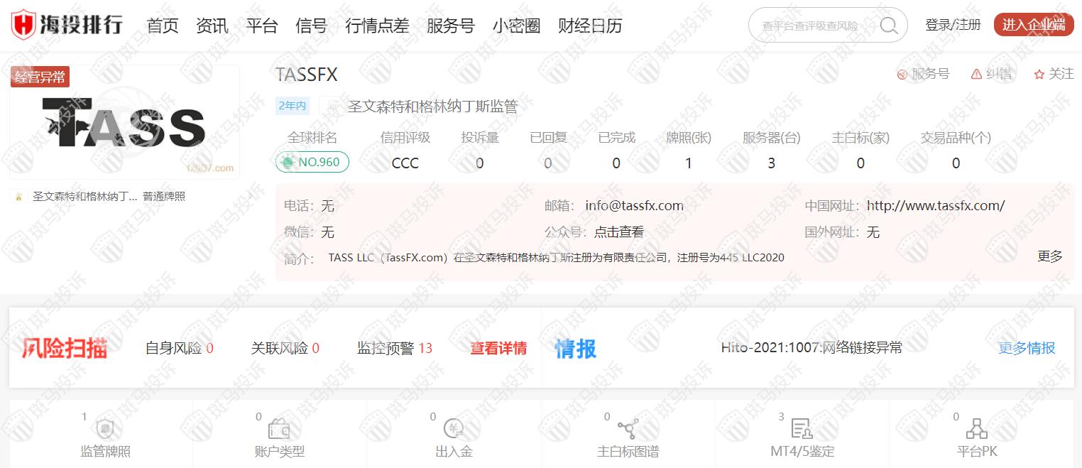 TASSFX成立于2020年,全球排名960名,目前受圣文森特和格林纳丁斯FSA监管,但只有普通牌照,风险扫描显示13条风险,投资者交易需谨慎。