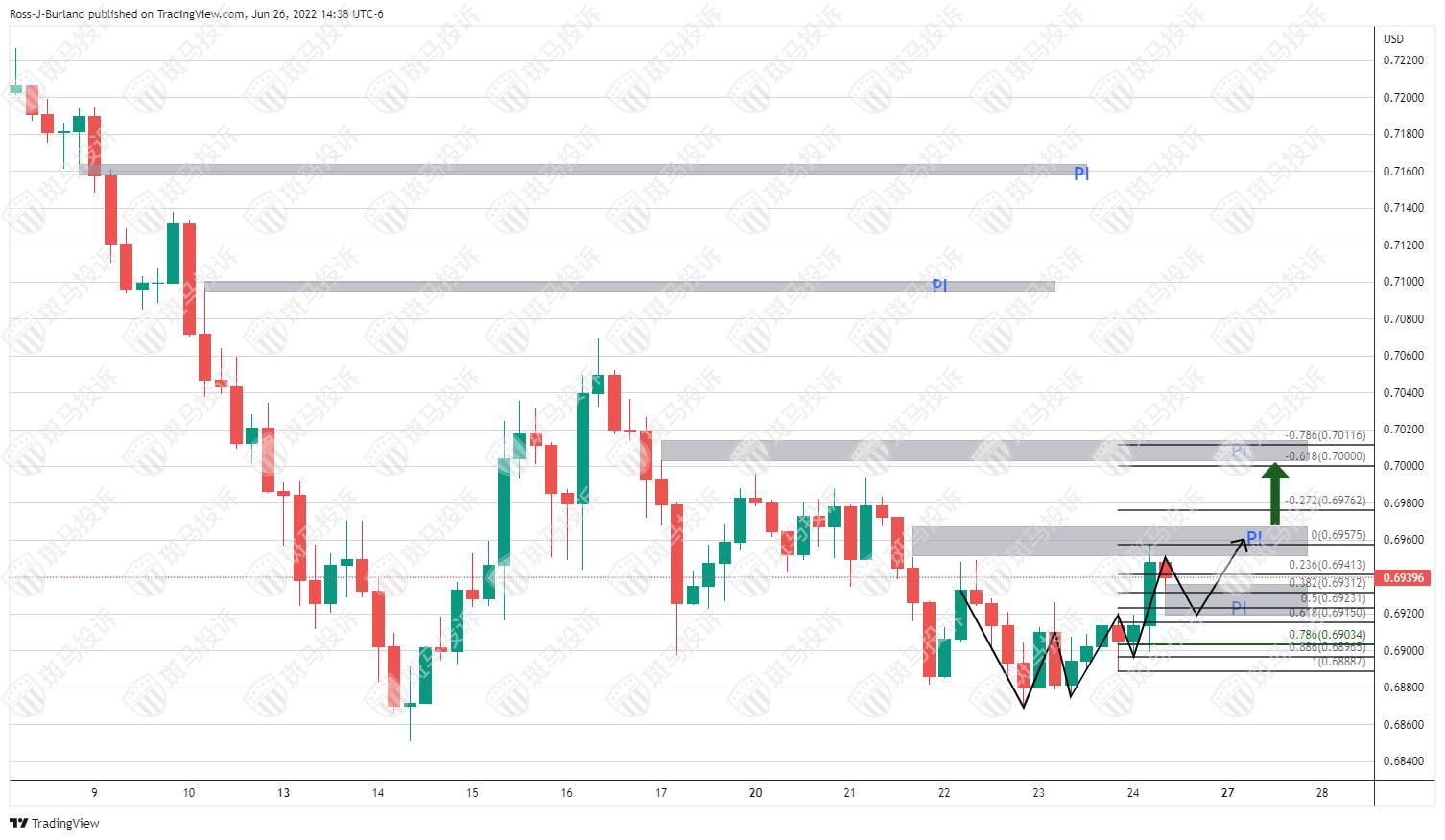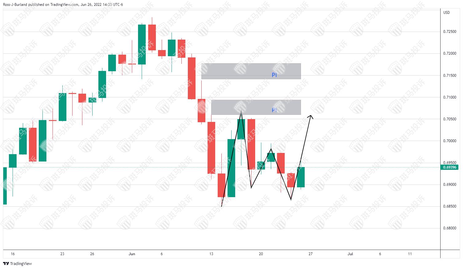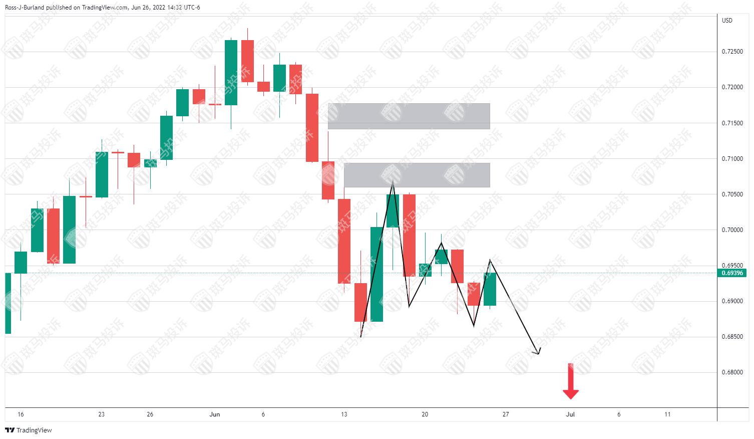 然而,上行存在价格不均衡,若汇价突破颈线0.6950会带来上行风险。