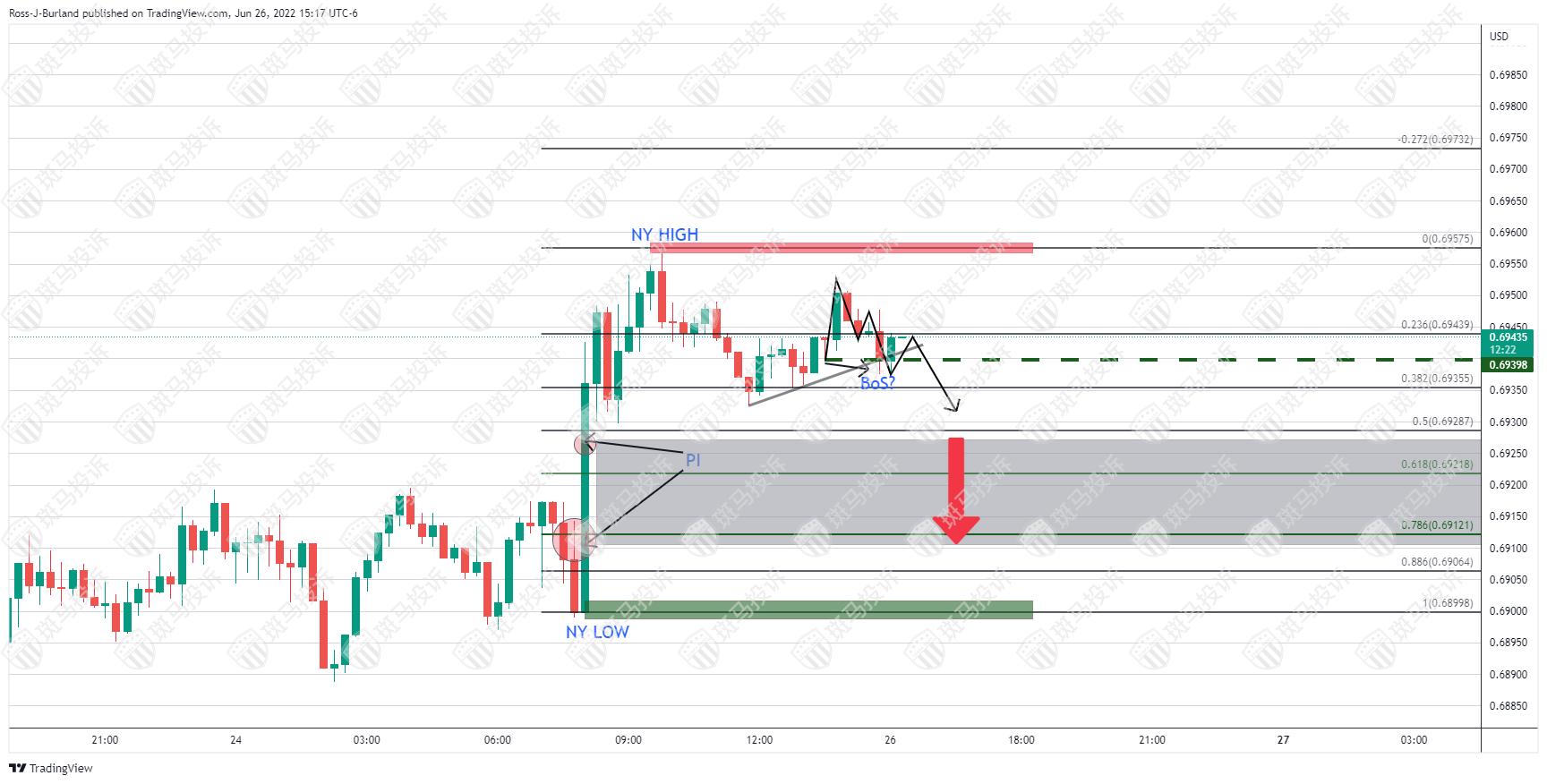 开盘来看,下行方面0.6930和0.6914区间的价格不均衡成为焦点。但汇价可能震荡上涨至美国时段高位,特别是在汇价遇阻0.6940形态的情况下。如果是这样,相当于汇价自15分钟图M形态阻力出现波动: