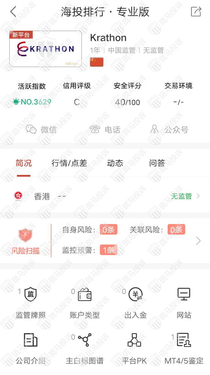 这家平台叫Krathon,成立于2021年,全球排名3629名,目前无监管,没有外汇牌照,不能做外汇保证金交易,风险扫描显示1条风险,投资者资金安全无保障。